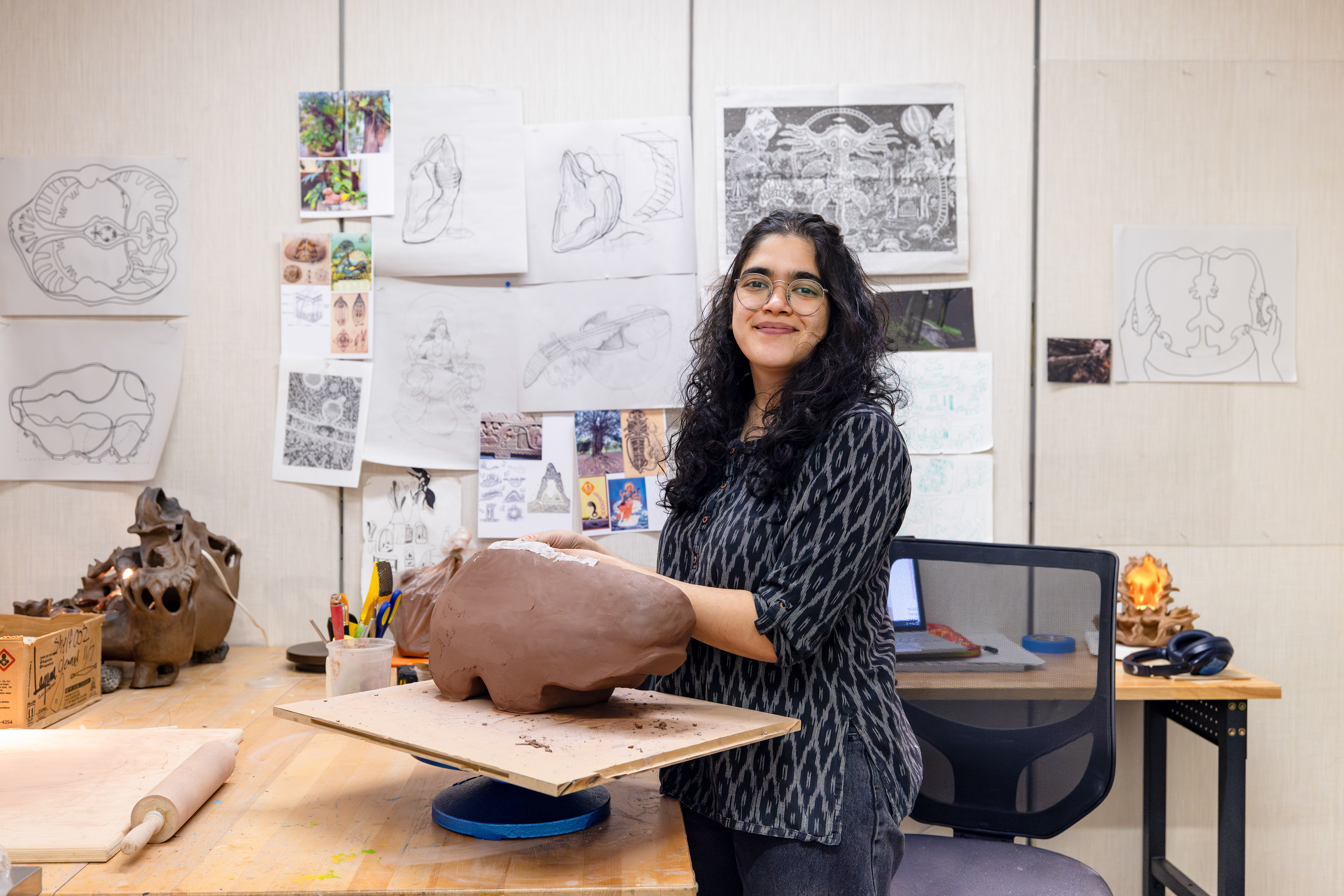 My practice reflects on the biological and cultural forces that shape symbiotic relations among living things. Guided by plant and animal morphology, I use clay to build sculptures that articulate and protect inner worlds. I explore themes of somatic awareness and habitation through constructing structures that reference caves, nests, and anatomical cavities. Integrating and juxtaposing ceramics with digital processes, I investigate experiences of scale and materiality--what it means to feel small in a vast network, how to live in a body that is home to many smaller worlds.